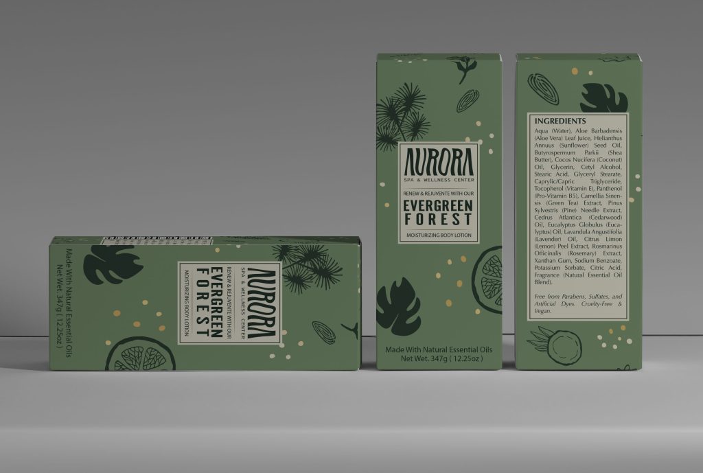 One of the hardest parts was coming up with a good product name and ingredient list. I knew what I wanted the design to look like, but finding ingredients that matched the brand’s natural values—and that sounded realistic—took a lot of research. The same goes for the name “Evergreen Forest.” I wanted something that matched the look, scent, and overall feel of the product.