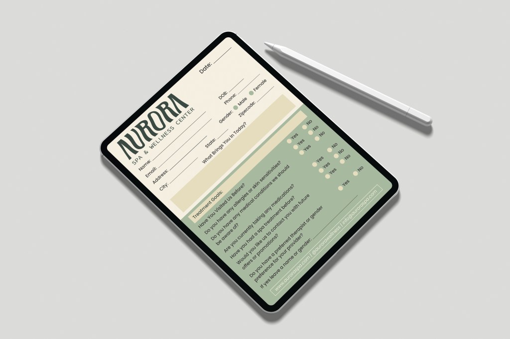 The overall goal was to keep things simple but elegant—something that reflects Aurora’s brand and makes clients feel welcome without overwhelming the space. The finished design complements the rest of the brand identity and helps create a cohesive, relaxing environment right from the front desk.
